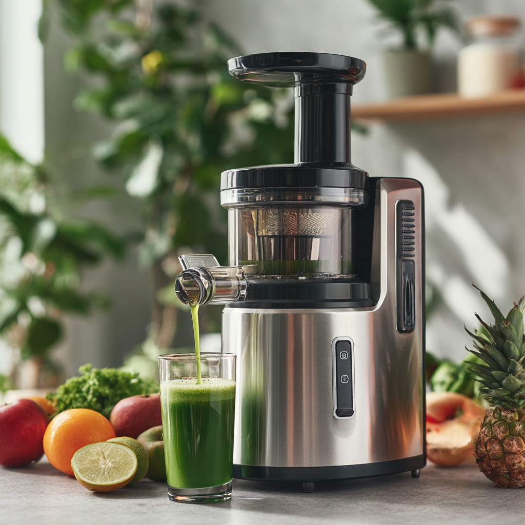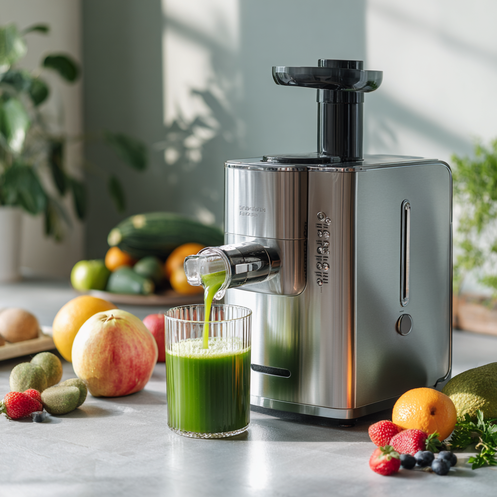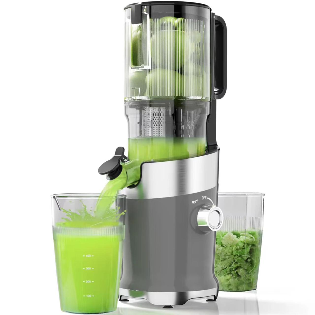 عصارة فواكه كهربائية حديثة (Juicer Machine) باللون الرمادي/الأسود مع ستانلس ستيل